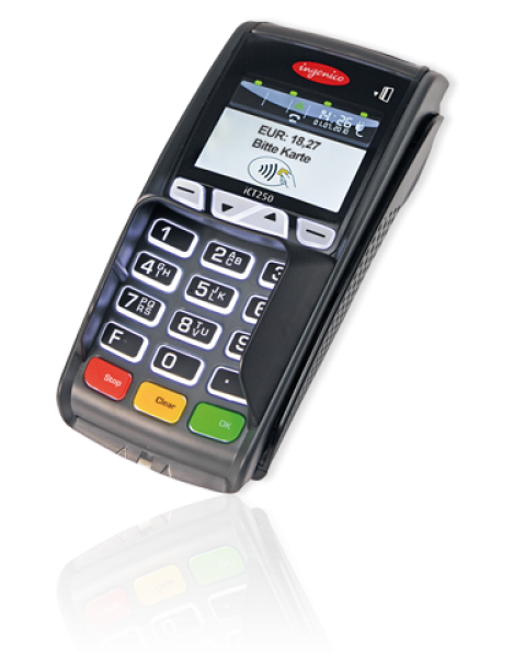 Wenn Sie zwischen klassischen und kontaktlosen Bezahlarten wählen möchten, dann sollten Sie sich für das stationäre Terminal iCT250 entscheiden. Beim kontaktlosen Bezahlen ist das Einstecken oder Durchziehen der Karte nicht mehr nötig. Der Bezahlprozess läuft berührungsfrei ab, die Karte muss nicht mehr aus der Hand gegeben werden und macht so das Bezahlen sauber.